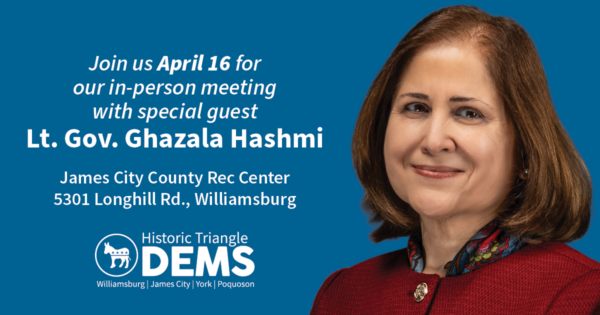 - Don’t miss our April meeting held IN PERSON at the James City County Recreation Center, 5301 Longhill Rd., Williamsburg. Our special guest will be Lt. Gov. Ghazala Hashmi. RSVP here.