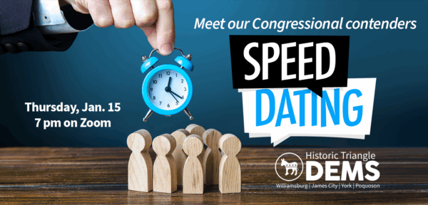 Thursday, Jan. 15 at 7 pm — Speed Dating with Congressional candidates at our January meeting on Zoom. Hear from the eight candidates who are vying for the Democratic nomination for Congress in the 1st District and the job of defeating Rob Wittman. Register here